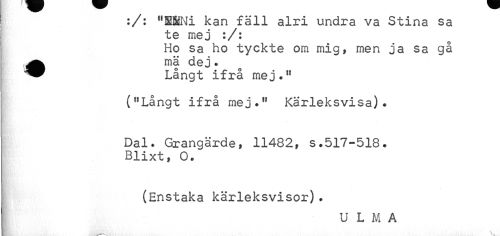 //// :/: "SfidNi kan fäll alri undra va Stina sa te mej :/: //// Ho sa ho tyckte om mig» men ja sa ga //// ? mä dej. //// Långt ifrå mej.11 //// ("Långt ifrå mej." Kärleksvisa). //// Dal. Grangärde , 11482, s.517-518. Blixt, O. //// (Enstaka kärleksvisor). //// ULMA ////