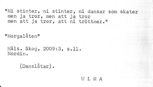 //// "Ni stinter, ni stinter, ni dansar som skater men ja tror, men att ja tror men att ja tror, att ni tröttner.11 //// "Horgalåten" //// Hals. Skog, 2009:3, s.ll. Nordin. //// (Danslåtar). //// U L M A ////