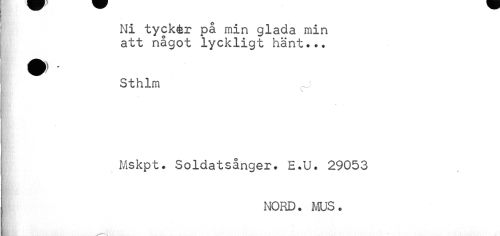 //// Ni tyckér på min glada min att något lyckligt hänt... //// Sthlm //// Mskpt. Soldatsånger. E.U. 29053 //// NORD. MUS. ////
