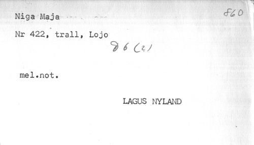 //// Niga Maja -- - ^ ^ //// Nr 422, trall, Lojo //// 9 t O*' //// mel.not. //// LAGUS NYLAND //// « ////