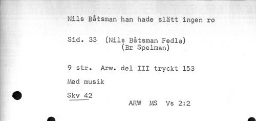 //// Nils Båtsman han hade slätt ingen ro //// Sid. 33 (Nils Båtsman Fedla) //// (Br Spelman) //// 9 str. Arw. del III tryckt 153 //// Med musik //// A Skv 42 //// " ARW MS Vs 2:2 ////