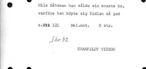//// 9 Nils Båtsman han sålde sin enaste ko, //// vårföre han köpte sig fidlan så god //// s.2ik 121 Mel•not• 8 str» //// ti'.'. , v //// SVANFELDT VISBOK //// « //// //// /