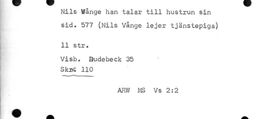 //// Nils Wange han talar till hustrun sin sid. 577 (Nils Vånge lejer tjänstepiga) //// 11 str. //// Visb. Budebeck 35 SkiÄ 110 //// ARW MS Vs 2:2 ////