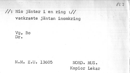 //// Si 3 //// //: Nio jänter i en ring ;// vackraste jäntan inomkring //// ! i I //// //// /Vg, Bo j //// Dr. //// i //// i //// i //// < //// i //// » v //// t. //// ¦ //// N.M. E.U. 13605 NORD. MUS. //// Kopior Lekar ////