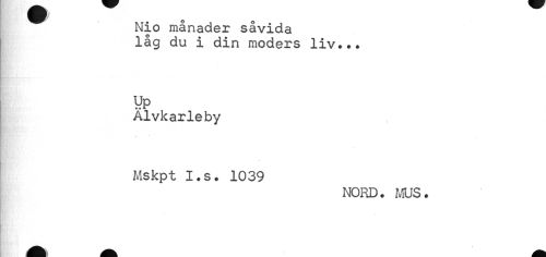 //// Nio månader såvida //// låg du i din moders liv... //// yp //// Älvkarleby //// Mskpt I.s. 1039 //// NORD. MUS. ////