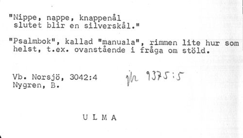 //// "Nippe, näppe, knappenål slutet blir en silverskål.11 //// "Psalmbok", kallad "manuala", rimmen lite hur som helst, t.ex. ovanstående i fråga om stöld. //// Vb. Norsjö, 3042:4 m //// Nygren, B. //// U L M A ////