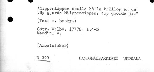 //// "Nippentippen skulle hålla bröllop en da söp gjorde Niippentippen, söp gjorde ja." //// ^ (Text m. beskr.) //// Gstr • Valbot 17778, s.4-5 Wendin, V. //// (Arbetslekar) //// D_329 LANDS MALS ARKIVET UPPSALA //// ¦ ////