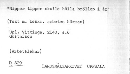 //// "Nipper tippen skulle hålla bröllop i år" //// i //// ! //// ! //// i //// ! //// (Text m. beskr. arbeten härmas) //// Upl« Vittinge, 2140, s.6 Gustafson //// i //// f //// i i //// (Arbetslekar) r //// » //// D 329 //// --LANDS MÅLS ARKIVET UPPSALA ! //// ¦ //// i //// r //// i ////