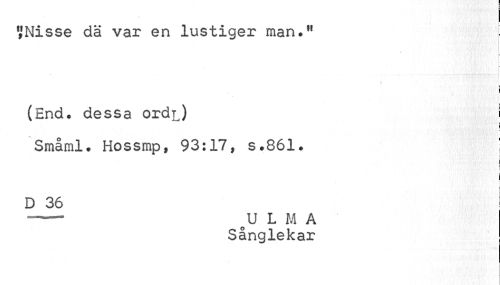 //// VNisse dä var en lustiger man.11 //// j //// < '' I j //// (End. dessa ordiJ I //// i //// Småml. Hossmp, 93:17, s.861* j //// I //// i- //// D 36 I //// --oU L M A //// Sånglekar ////