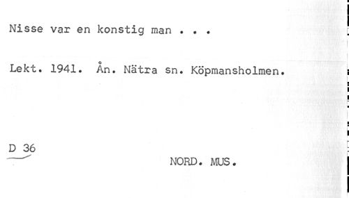 //// I //// Nisse var en konstig man . * . r //// i //// o //// Lekt. 1941. An. Nätra sn. Köpmansholmen. i //// i ¦ //// p //// ! ¦ //// i i //// D 36 : //// f //// " NORD. MUS. j //// I ////