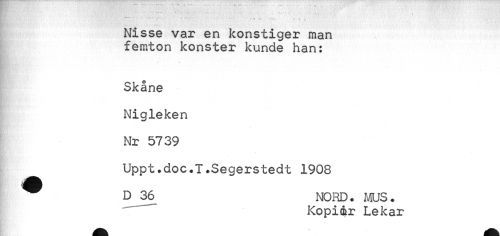 //// * ¦ • • a» ,. . * r //// Nisse var en konstiger man femton konster kunde han: //// Skåne Nigleken Nr 57 39 //// Uppt.doc.T.Segerstedt 1908 //// ^ D 36 NORD. MUS. //// Kopimr Lekar ////