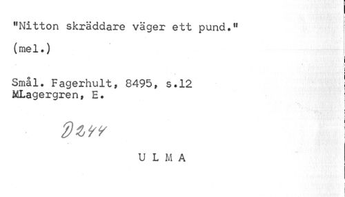 //// I //// h //// "Nitton skräddare väger ett pund." (mel.) //// • r //// = //// i //// Smål. Fagerhult, 8495, s.12 I //// MLagergren» E. [ //// r //// dtw \ //// v //// U L M A //// r ////