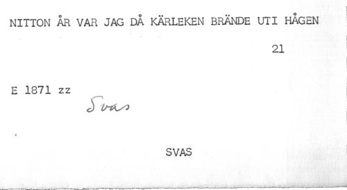 //// NITTON ÅR VAR JAG DÅ KÄRLEKEN BRÄNDE UTI HÅGEN //// i //// 21 //// E 1871 zz //// c) U-t^/i //// 9 //// SVAS ////