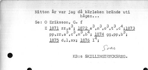//// 9 //// Nitton år var jag då kärleken brände uti //// hågen... //// Se: O Eriksson» G. f //// E 1871 zz,a3; 1872 e3,n3»o3,t3»c4;1873 pp,rr,a3,c3,n"',b4; 1874 gg,pp,b°; 1875 d,l,xx; 1876 l4; //// # KB:s SKILLINGTRYCKSREG. ////