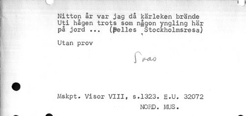 //// K .__ //// Nitton år var jag då kärleken brände //// Uti hågen trots som n|gon yngling här //// på jord ... (Pelles Stockholmsresa) //// i //// Utan prov //// i IHM //// ¦ //// Mskpt. Visor VIII, s.1323. E.U. 32072 //// NORD. MUS. ////