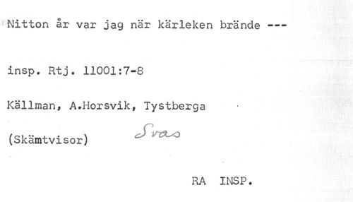 //// Nitton år var jag när kärleken brände --- //// insp. Rtj. 11001:7-8 Källman, A.Horsvik, Tystberga (Skämtvisor) //// RA INSP. ////