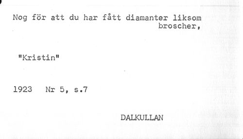 //// Nog för att du har fått diamanter liksom //// broscher, //// "Kristin" //// t //// 1923 Nr 5, s.7 //// DALKULLAN ////