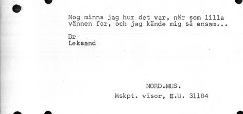 //// Nog minns jag hur det var, när som lilla vännen for, och jag kände mig så ensam... //// Dr //// Leksand //// ¦ //// ¦ //// NORD.MUS. Mskpt. visor, E.U. 31184 //// för.; ////