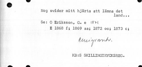 //// Il ¦ vB1 //// I , Nog svider mitt hjärta att lämna det //// land... //// Se: 0 Eriksson, G. e i^vi //// E 1868 f; 1869 aa; 1872 oo; 1873 c; //// toitA Wi Qn^h/, //// ¦ //// KB :S SKILLINGTRYCKSREG. ////