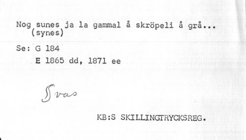 //// t ' //// Nog sunes ja la gammal å skröpeli a grå... i //// (synes) //// Se: G 184 //// E 1865 dd, 1871 ee //// KB:S SKILLINGTRYCKSREG. ////