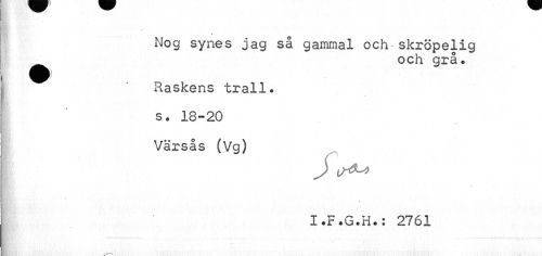 //// t //// Nog synes jag så gammal och skröpelig //// och grå. //// Raskens trall. //// s. 18-20 Värsås (Vg) //// t/-' ¦ 'C'"- ' //// I.F.G.H.: 2761 //// I ////