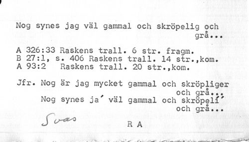 //// Nog synes jag väl gammal och skröpelig och //// grå... //// A 326:33 Raskens trall. 6 str. fragm. //// A S; 26 Ra?kei?? trall. 14 str.,kom. //// A 93.2 Raskens trall. 20 str.,kom. //// Jfr. Nog är jag mycket gammal och skröpliger //// ? O //// Nog synes ja' väl gammal och skröpelf' //// och grå... //// J ^ RA ////