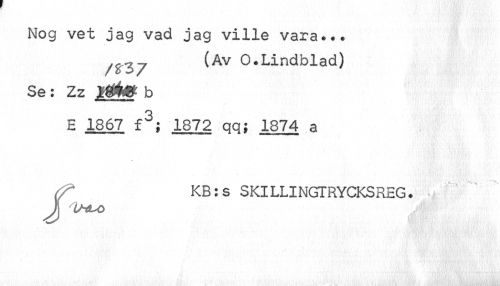 //// Nog vet jag vad jag ville vara... //// y (Av O.Lindblad) //// Se : Zz X&& b //// E 1867 f3; 1872 qq; 1874 a //// /KB:s SKILLINGTRYCKSREG. ////