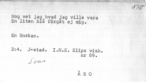 //// - //// Nog vet jag^hvad jag ville vara En liten blå förgät ej mig. //// En önskan. //// 3:4. J-stad. I.N.E. Slips visb. //// nr 89. //// J //// ÅBO ////
