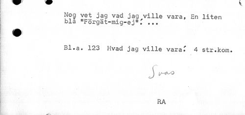 //// Nog vet jag vad jag ville vara» En liten //// bla "Förgat-mig-ej". ... //// Bl.a. 123 Hvad jag ville vara T 4 str.kom. //// •• % //// RA ////