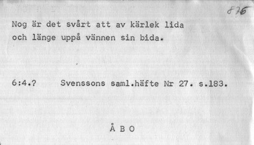 //// Nog är det svårt att av kärlek lida och länge uppå vännen sin bida. //// 6:4.? Svenssons saml.häfte Nr 27. s.183. //// ÅBO ////