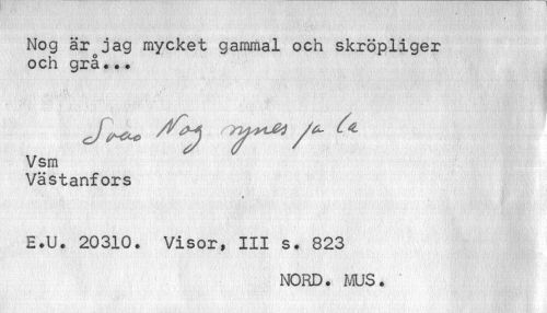 //// Nog är jag mycket gammal och skröpliger och grå..• //// I ' ' ' ' I I //// Vsm //// Västanfors //// t //// E.U. 20310. Visor, III s. 823 //// NORD. MUS. ////