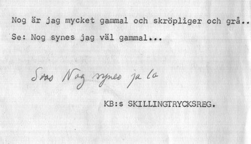 //// Nog är jag mycket gammal och skröpliger och grå.. Se: Nog synes jag väl gammal» //// A //// KB:s SKILLINGTRYCKSREG. //// » ////