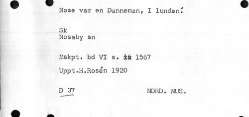 //// Nose var en Danneman, I lunden T //// Sk //// Nosaby sn //// Mskpt. bd VI s. 1567 Uppt.H.Rosén 1920 //// « //// D 37 NORD. MUS. ////