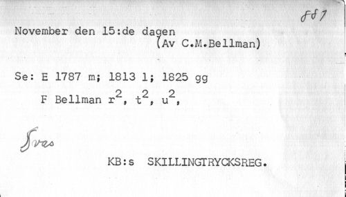 //// <H7 //// November den 15:de dagen //// lAv C.M.Bellman) //// ¦ //// Se: E 1787 ra; 1813 1; 1825 gg //// 2 2 2 F Bellman r , t , u , //// cfihiA //// KB:s SKILLINGTRYCKSREG. I //// j //// I ////