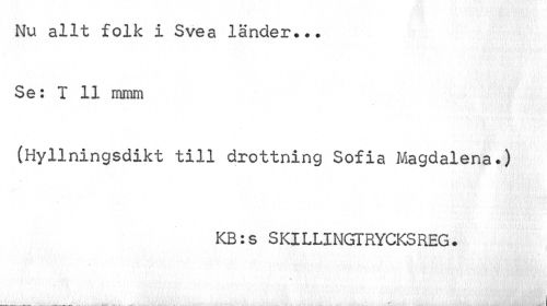 //// Nu allt folk i Svea länder... Se: T 11 mmm //// (Hyllningsdikt till drottning Sofia Magdalena.) //// KB:s S KlLLINGT RYCKSREG. ////