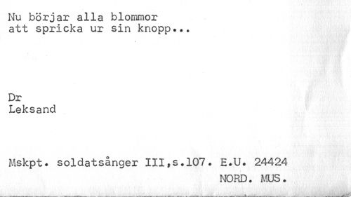 //// Nu börjar alla blommor att spricka ur sin knopp. //// Dr //// Leksand //// Mskpt. soldatsånger III,s.107. E.U. 24424 //// NORD. MUS. ////