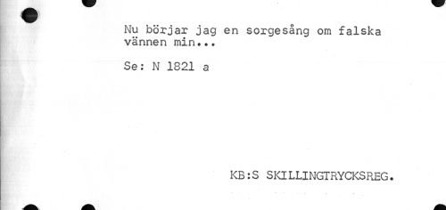 //// Nu börjar jag en sorgesång om falska vännen min... //// Se: N 1S21 a //// KB:S SKILLINGTRYCKSREG. ////