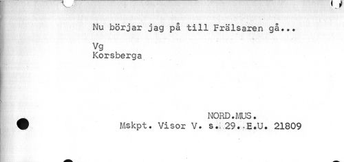 //// Nu börjar jag på till Frälsaren gå... //// Vg //// Korsberga //// //// /NORD.MUS. //// 9 Mskpt. Visor V. s.i 29. -E.U. 21809 ////