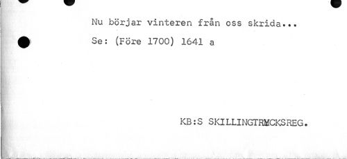 //// Nu börjar vinteren från oss skrida. 0 Se: (Före 1700) 1641 a //// f£é' //// ¦r. //// KB:S SKILLINGTRMCKSREG. //// ÖR ? >,- » r\ \X * . . //// ___,_____ ..._ l____.____ ////