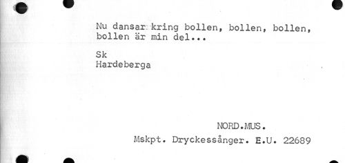 //// Nu dansar: kring bollen, bollen, bollen, bollen är min del... //// Sk //// Hardeberga //// NORD.MUS. Mskpt. Dryckessånger. E.U. 22689 ////