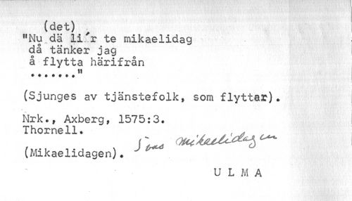 //// (det) //// flNu„dä li'r te rnikaelidag då tänker jag å flytta härifrån //// u //// • I //// (Sjunges av tjänstefolk» som flyttar). //// Nrk.» Axberg» 1575:3. //// Thornell. ,, . { * A //// c i //// (Mikaelidagen). //// U L M A ////