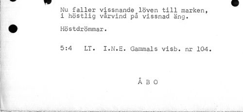 //// Nu faller vissnande löven till marken, i höstlig vårvind på vissnad äng. //// ^ Höstdrömmar. //// 5:4 LT. I.N.E. Gammals visb. nr 104. //// ÅBO //// i //// i ////