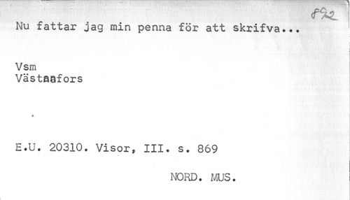 //// Nu fattar jag min penna för att skrifva... //// I //// Vsm //// Västaafors //// E.U. 20310. Visor» III. s. 869 //// NORD. MUS. ////