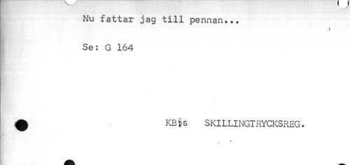//// Nu fattar jag till pennan... //// i //// Se: G 164 //// KB§s SKILLINGTRYCKSREG. //// * ////