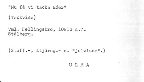 //// "Nu få vi tacka Eder" (Tackvisa) //// Vml. Fellingsbro, 10813 s.7. Stålberg. //// (Staff.-, stjärng.- o. "julvisor".) //// U L M A ////