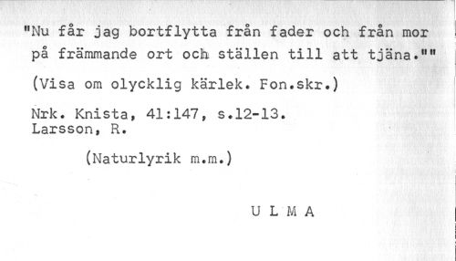 //// flNu får jag bortflytta från fader och från mor på främmande ort och ställen till att tjäna t1111 //// i //// (Visa om olycklig kärlek. Fon.skr.) //// Nrk. Knistaf 41:147, s.12-13. j //// Larsson, R. //// (Naturlyrik m.m.) //// : //// U LM A //// i ¦ //// i //// i //// i i ////