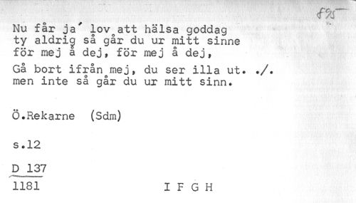 //// 4 C/J //// O f ' //// Nu får ja lovoatt hälsa goddag ty aldrig så går du ur mitt sinne //// for mej å dej, för mej å dej, //// Gå bort ifrån mej, du ser illa ut* ./. men inte så går du ur mitt sinn. //// - i //// Ö.Rekarne (Sdm) //// s .12 D 137 //// 1181 I F G H ////