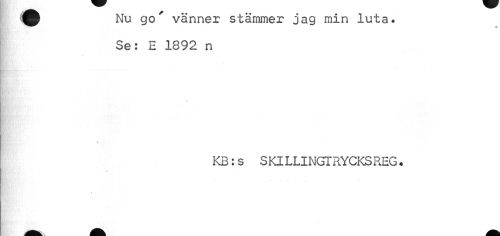 //// Nu go vänner stämmer jag min luta. //// nx» fr :. ¦ 7XT ' f //// Se: E 1892 n //// % //// ? //// KB:s SKILLINGTRYCKSREG. //// « ////