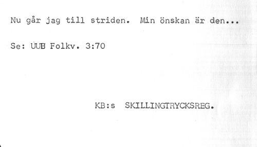 //// Nu går jag till striden. Min önskan är den... Se: UUB Folkv. 3:70 //// KB:s SKILLINGTRYCKSREG. ////