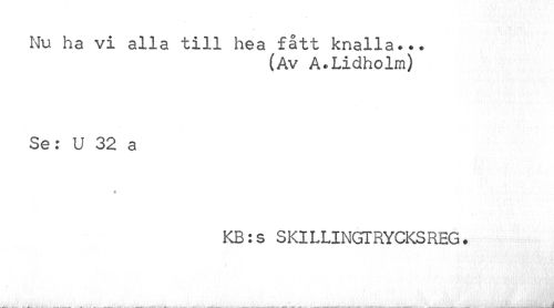 //// Nu ha vi alla till hea fått knalla.•• //// (Av A.Lidholm) //// Se: U 32 a //// « //// KB:s SKILLINGTRYCKSREG. ////